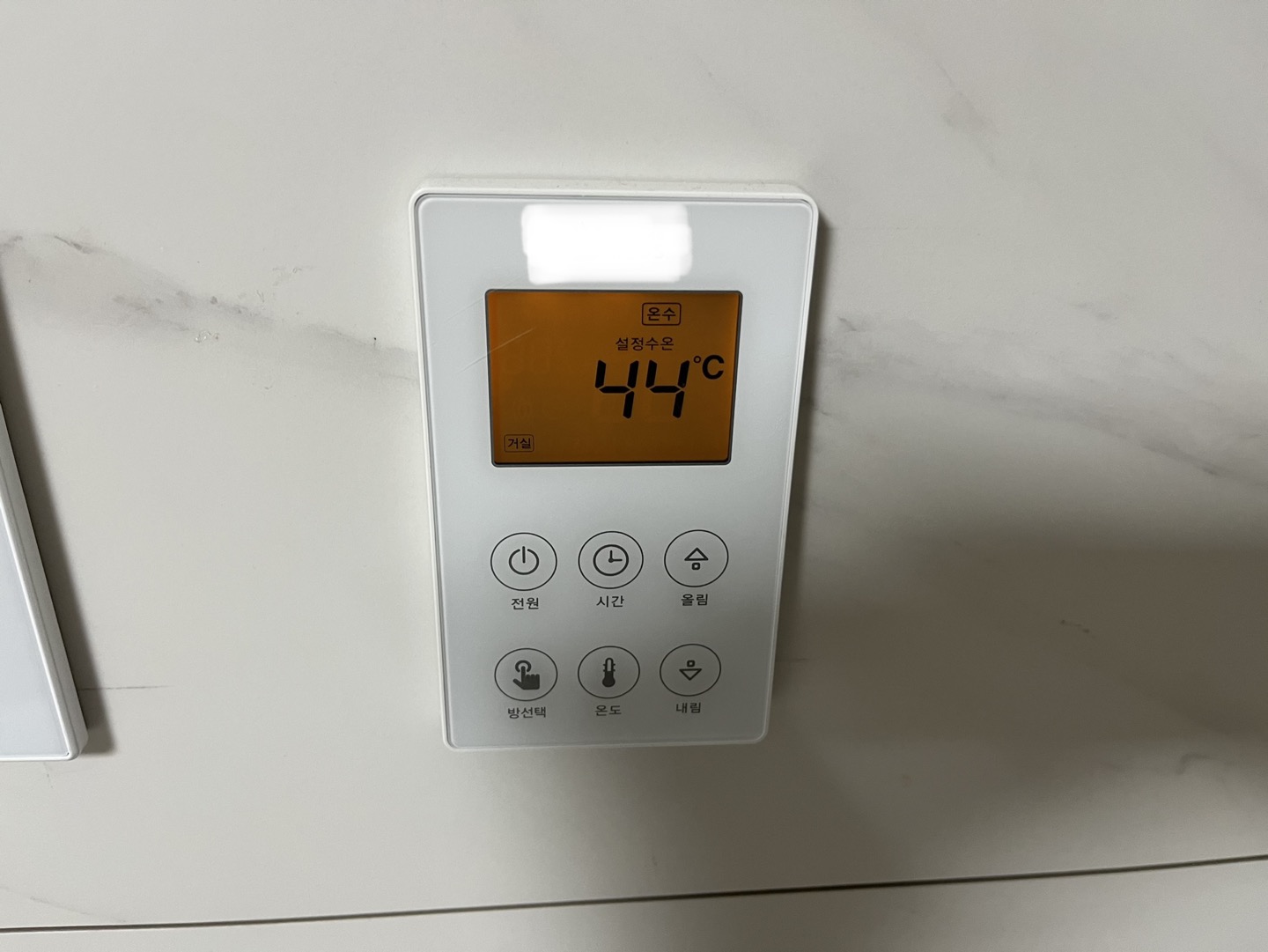 일반적으로 샤워시에 사용하는 온수의 경우 온도가 50도 이상으로 기본 설정되어 있습니다. 우리가 샤워할 경우 50도 이상으로 씻지 않습니다. 그렇기 때문에 불필요한 보일러를 가동하지 않게 하기 위해서는 이 난방 온수의 온도를 낮추어야 합니다. 그렇게 되면 불필요하게 보일러를 가동하여 온수의 온도를 높이지 않게 되는 것입니다. 저는 현재 40-42도로 설정해서 사용 중입니다. 원래였으면 수도꼭지를 가운데 놓아야 제가 원하는 온도이지만 지금은 약간 더 온수 방향으로 틀어야 제가 원하는 온도가 나오게 됩니다. 이 말은 보일러가 온수를 효율적으로 만들어내고 있다는 소리입니다.