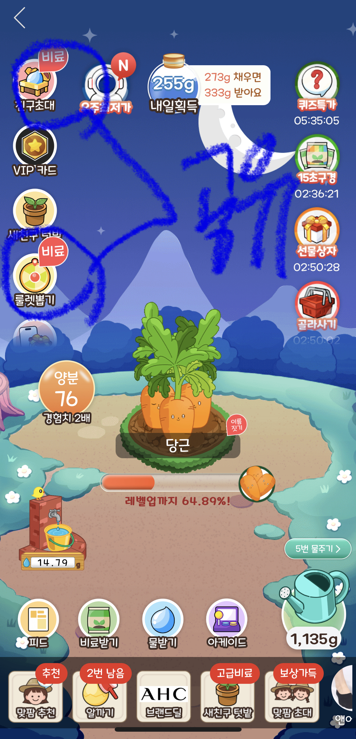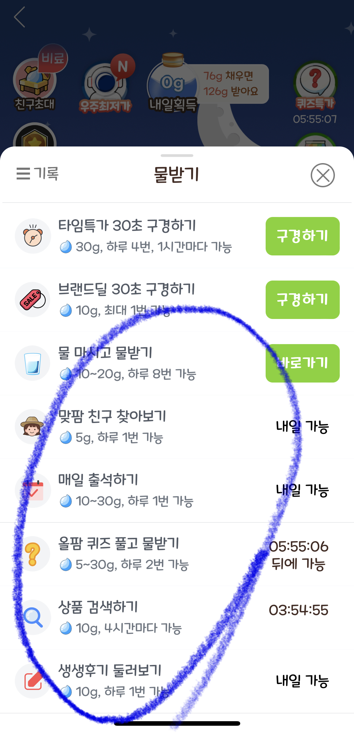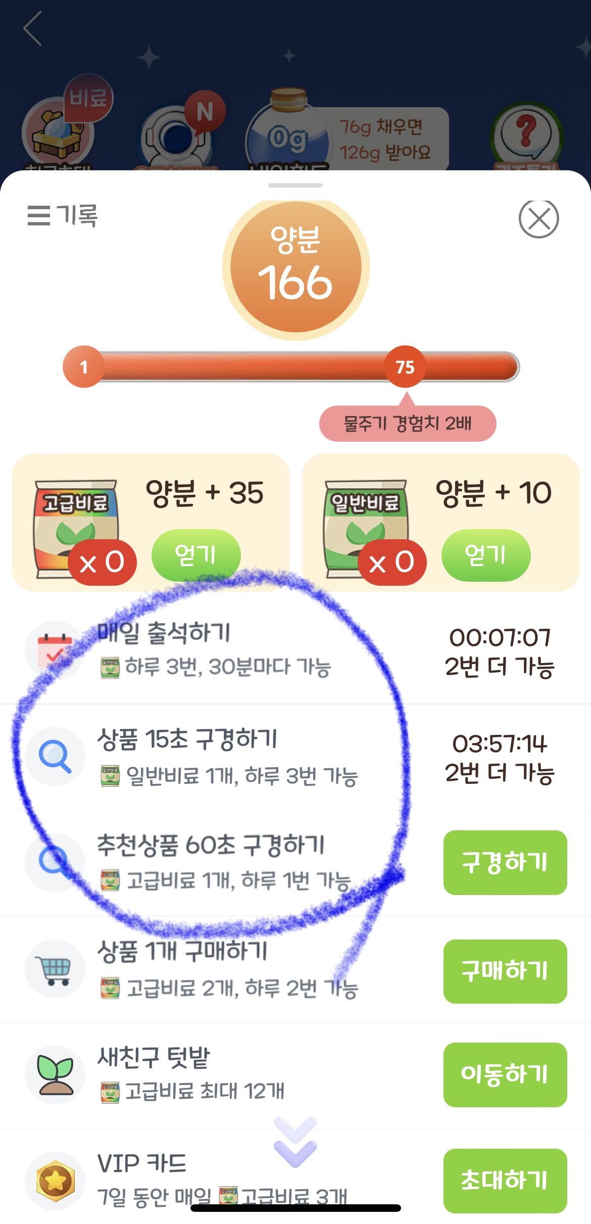 비료와 물받기는 최소한 아래의 선택된 것들은 모두 받아주세요. 30초 이상 구경해야하는 것들은 시간이 많이 소요되기 때문에 선택적으로 받으시면 됩니다. 비료의 경우에는 무조건 많이 받으셔야하기 때문에 60초 구경하기도 반드시 해주세요. 꼭 해야할 항목은 아래에 표시해놓았으니 참고해주세요.