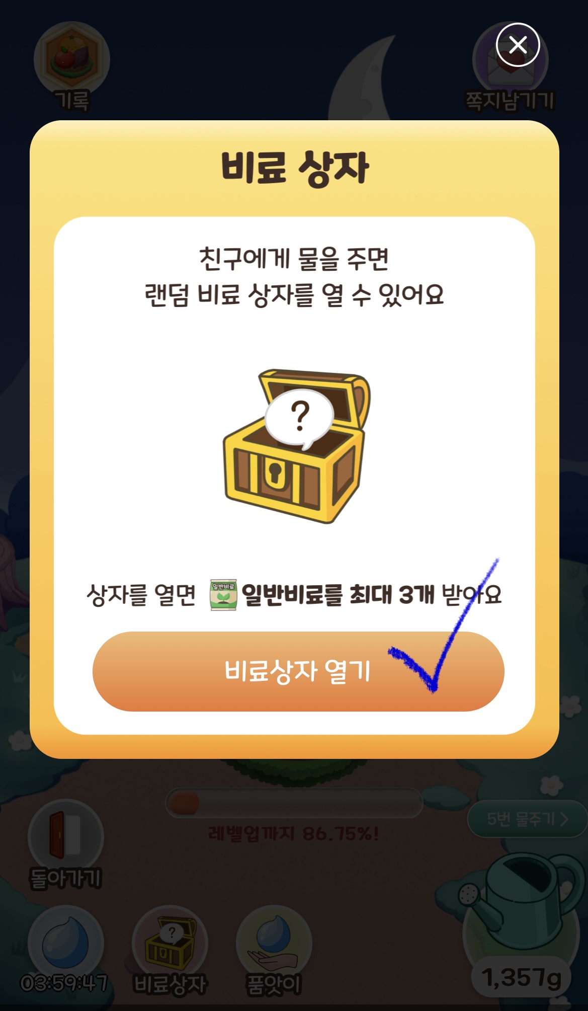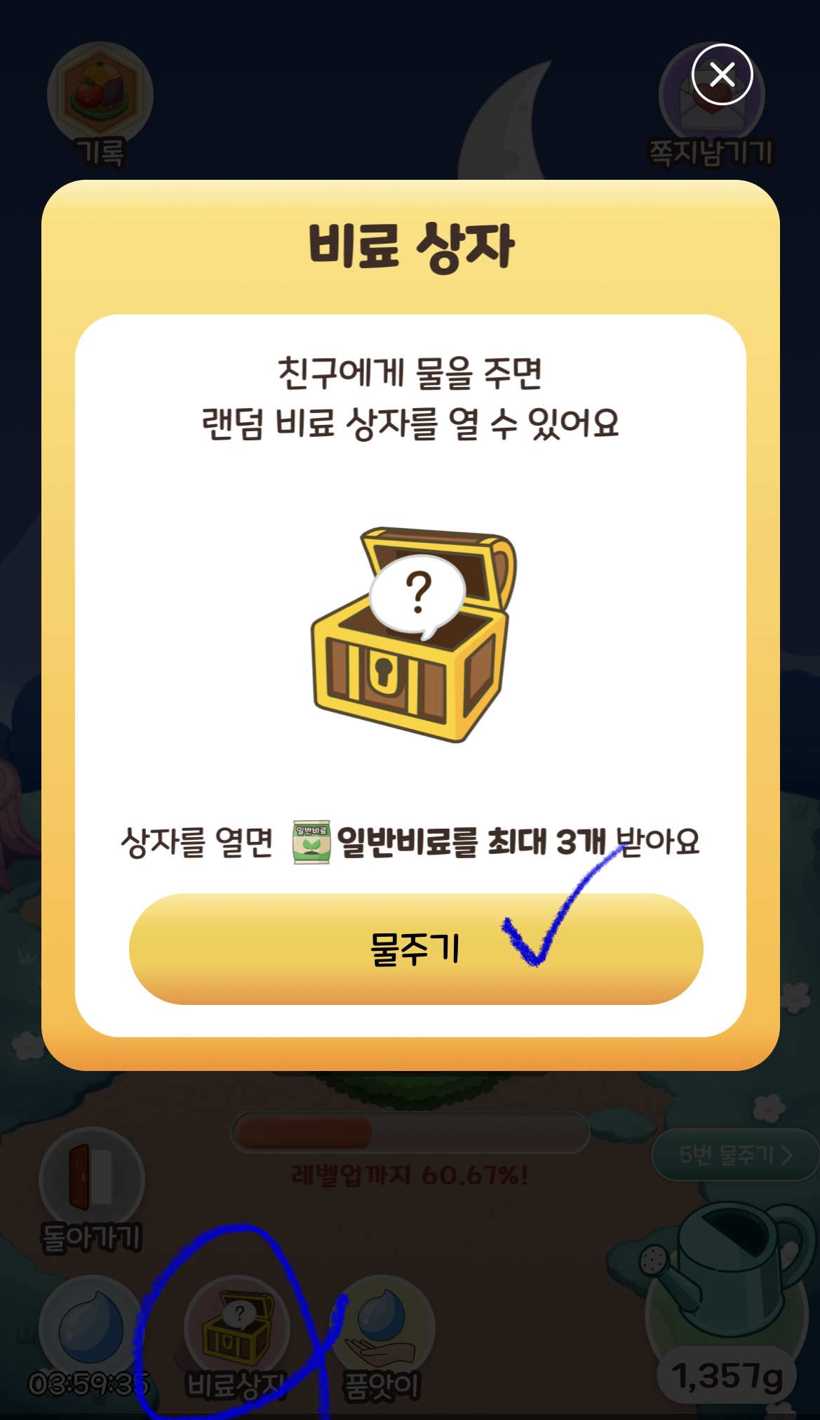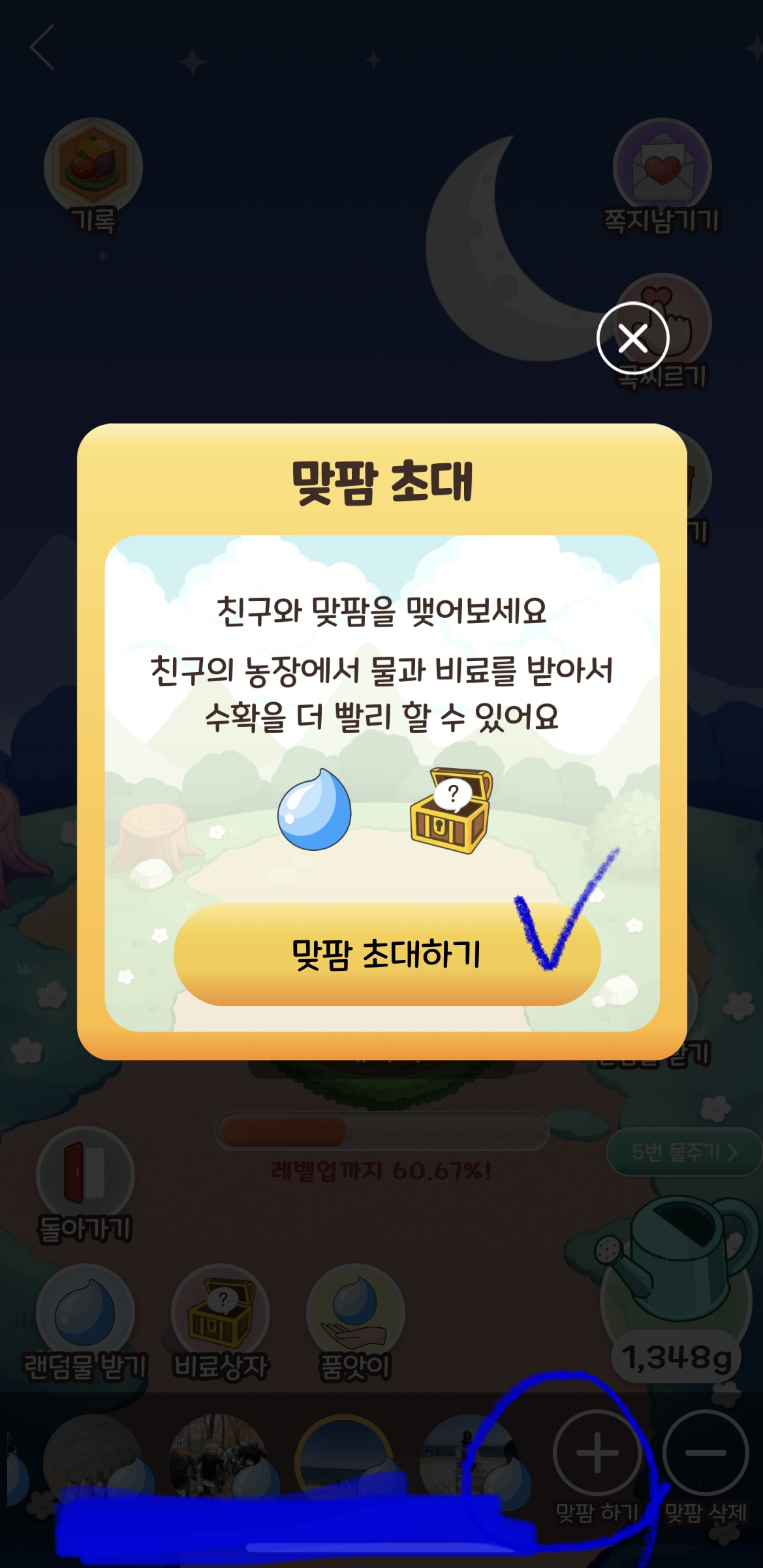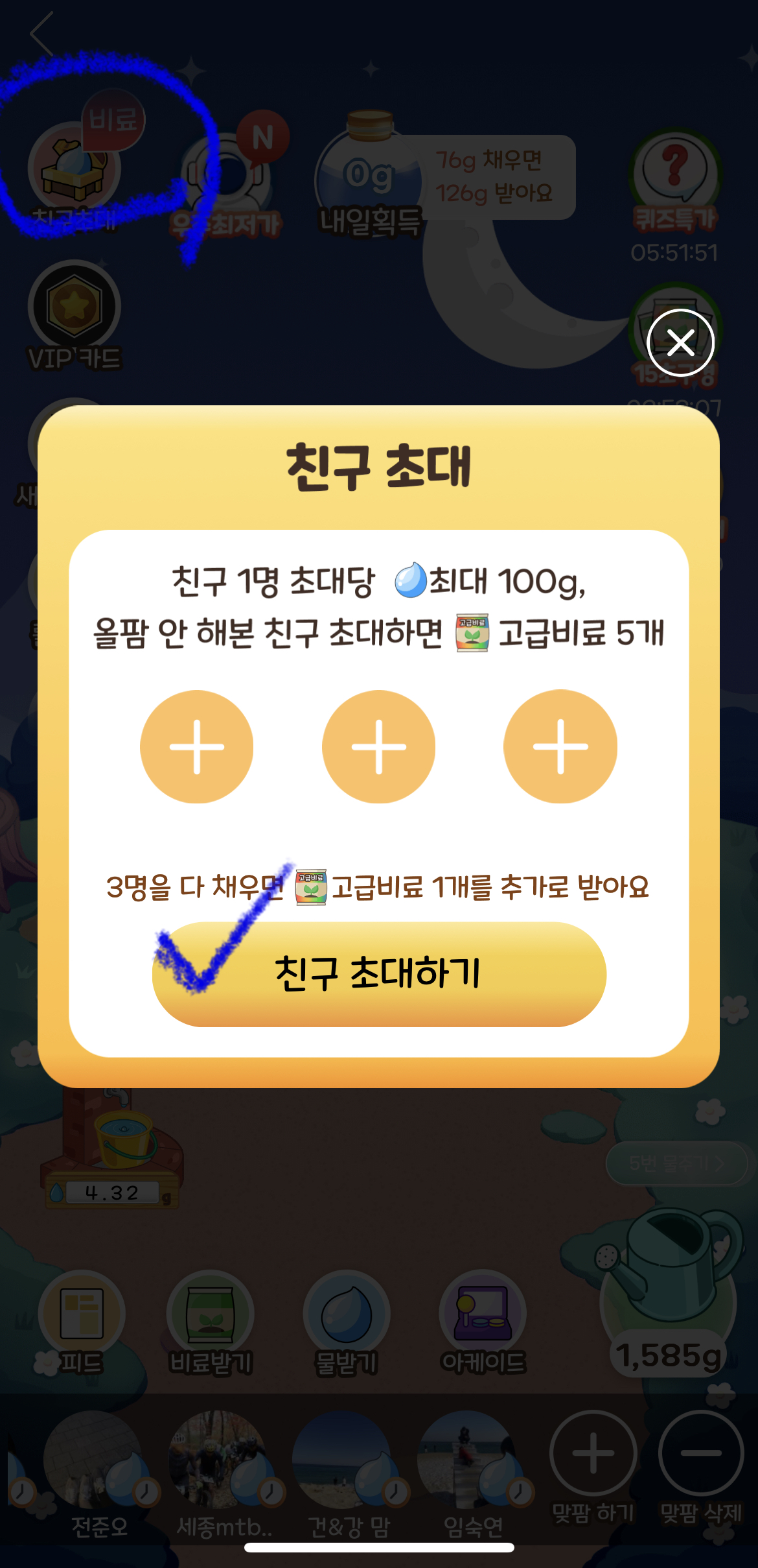 친구를 초대하여 맞팜을 하게 된다면 위와 같이 물과 비료를 받을 수 있습니다.