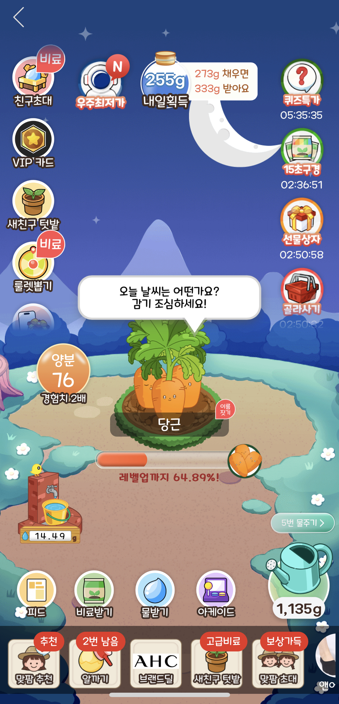 물주기는 비료가 75이상일 경우에만 실시해야 합니다. 그래야 경험치를 2배씩 받는 것을 유지할 수 있고 만약 계속 물을 줘서 비료가 낮아지는 경우 비료를 다시 올릴 소요되는 비료와 물 소모량이 더 크기 때문입니다.