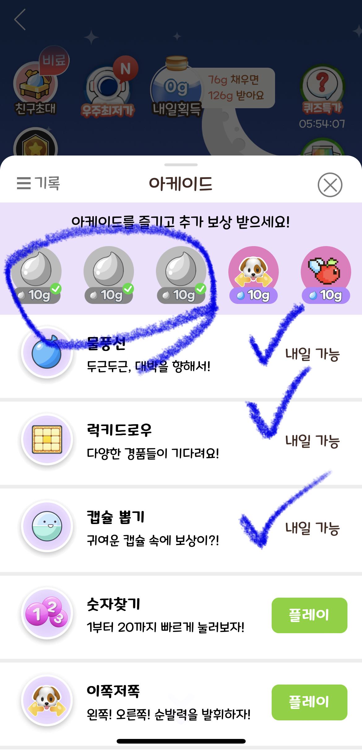 아케이드 속 미니게임을 통해 물, 비료를 랜덤으로 얻을 수 있습니다. 물풍선 터뜨리기, 럭키드로우, 캡슐 뽑기는 손이 많이 가지 않기 때문에 이 3개는 필수적으로 하시는 것이 좋습니다. 나머지 게임은 손이 조금 가기 때문에 저는 자주 하지는 않지만 모두 하는 것이 좋습니다.