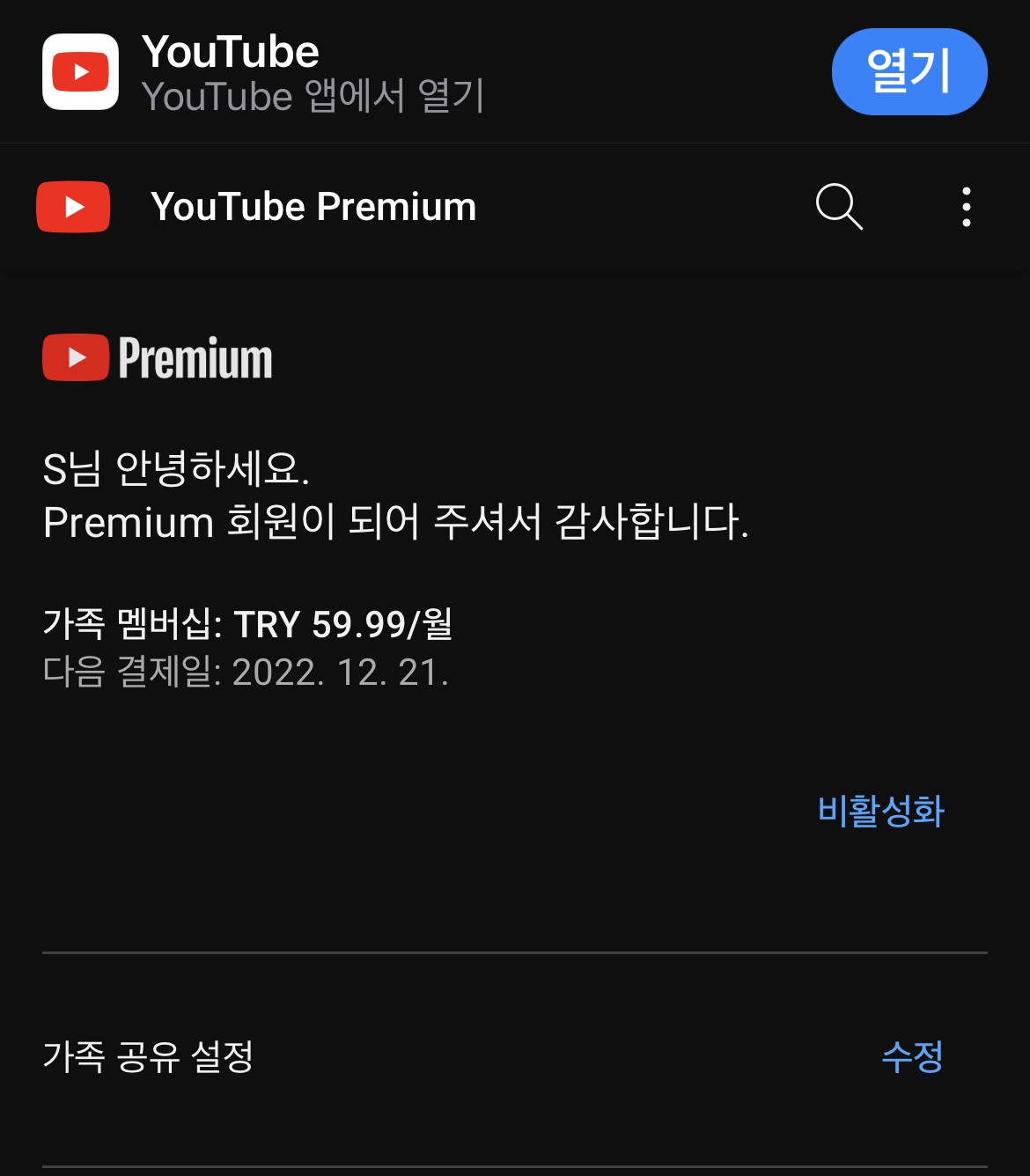 저는 이미 결제를 완료한 상태이기 때문에 구매항목 및 멤버십이라고 떠있는 것이고 멤버십이 만료되어 있으신 분들은Youtube premium 멤버십 가입이 떠있을 겁니다.