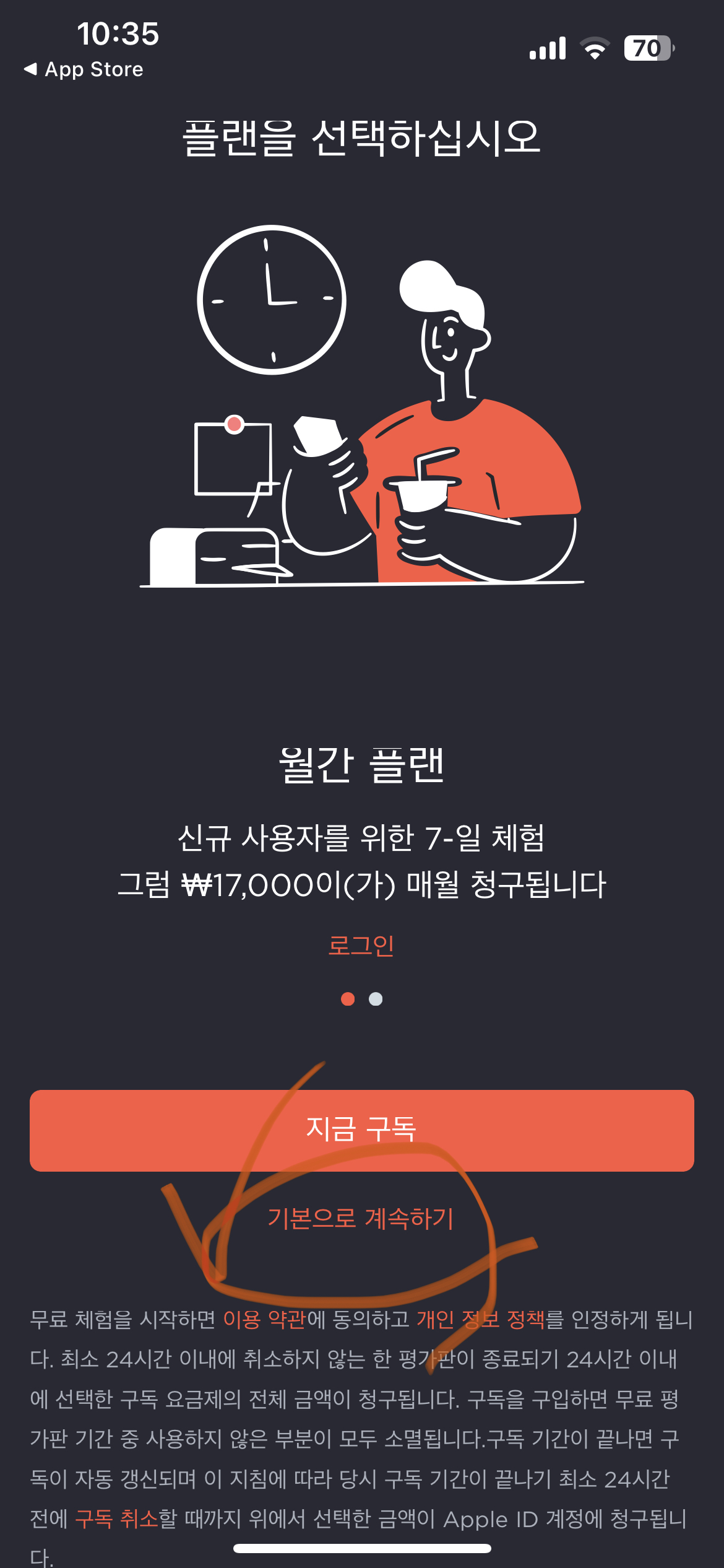 처음에 들어가면 가입 문구가 나오지만 '기본으로 계속하기'를 누릅니다. 그 뒤에 바로 국가를 선택하게 됩니다.