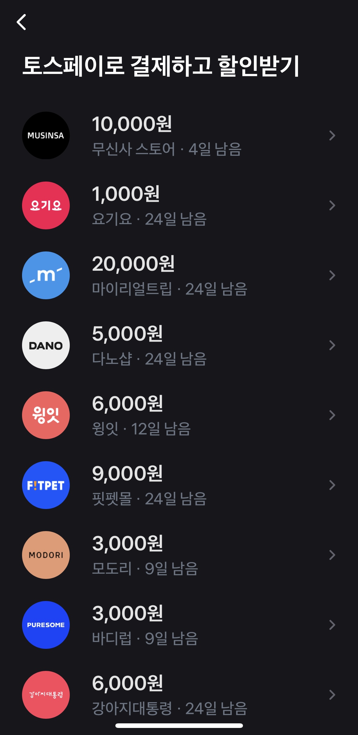 저는 바로 출금하는 것보다 아래와 같이 결제시 사용하는 것을 추천드립니다. ‘혜택’ 탭으로 들어가게 되면 ‘토스페이로 결제하고 할인받기’가 있습니다. 여기에 들어가면 토스페이로 할인되는 곳이 있는데 전 이곳에서 결제할 일이 있는 경우에만 포인트를 소진합니다.