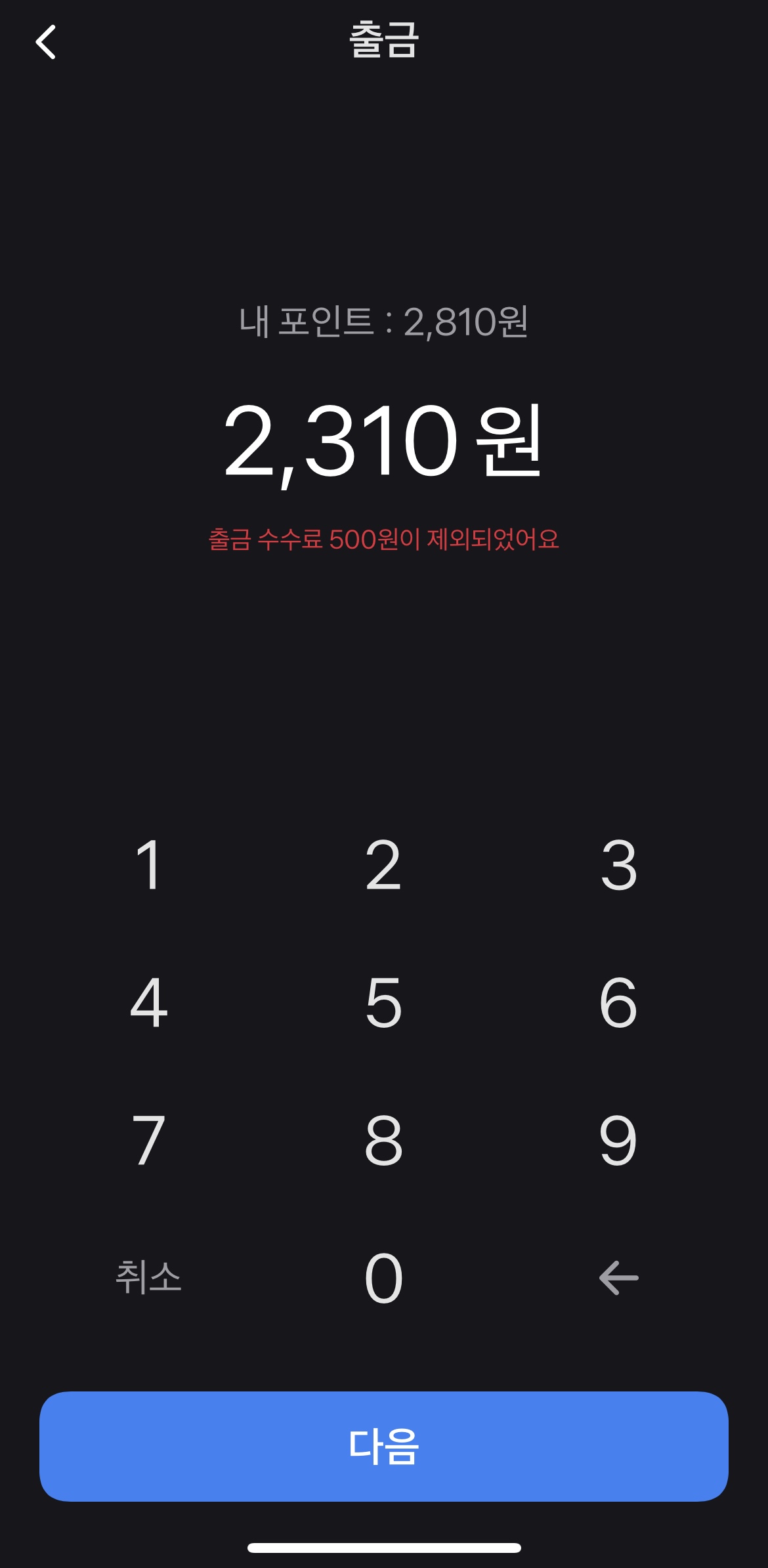 출금하기 버튼을 누르면 바로 금액을 출금할 수 있습니다. 하지만 출금 포인트가 5000포인트 미만일 경우 수수료가 발생하게 되는데 500원의 수수료가 부과됩니다. 500원이면 열심히 시간 내서 모아 왔던 포인트가 날아가기 때문에 추천드리지는 않습니다.