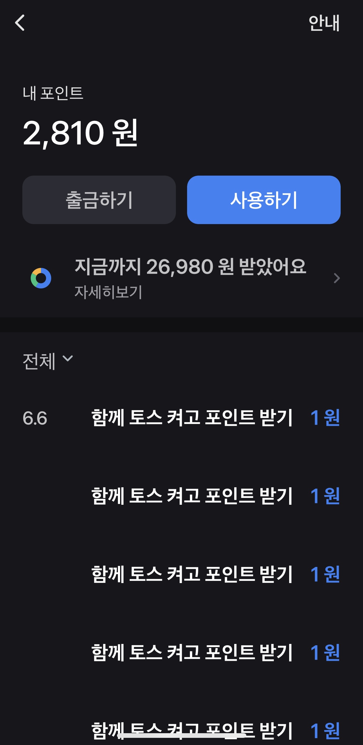 토스 우주 켜기라는 토스 포인트 혜택이 있어 함께 공유드립니다. 링크로 사람들에게 공유해서 이걸로만 하루 최대 266원의 포인트를 쌓을 수 있어요!