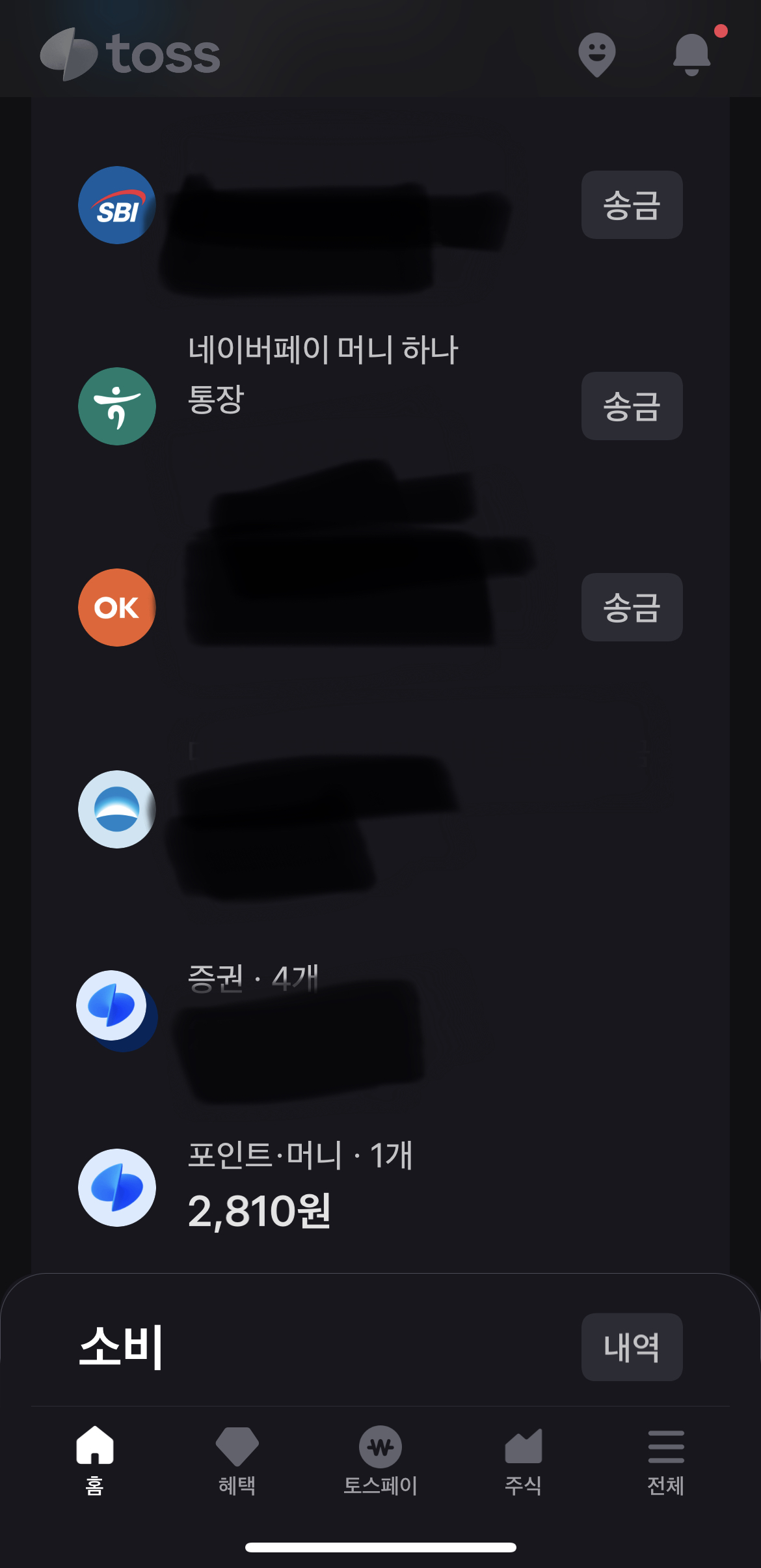 토스 어플에서 바로 현금으로 바꿀 수 있습니다. 아래와 같이 토스에 들어가게 되면 계좌와 포인트가 뜹니다.
