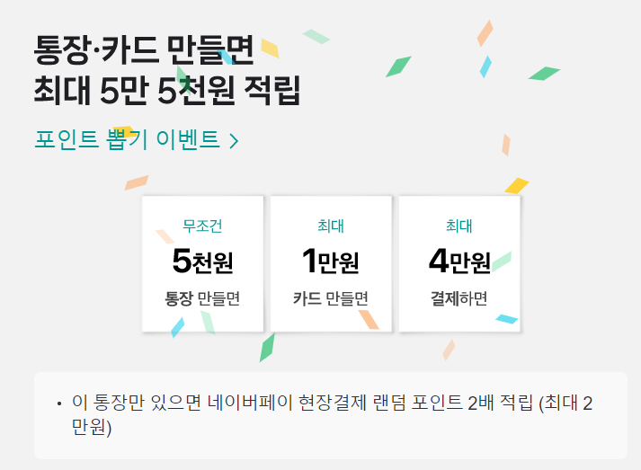 추가 이벤트가 있습니다. 통장을 만들면 무조건 5천원을 주며 통장으로 결제하면 추가 금액으로 뽑기 당첨 금액이 부여됩니다. 3회로 나뉘어 부여되는데 최대 3만 포인트까지 줍니다. 전 현재 1번 통장으로 머니결제를 진행했는데 7천 원에 당첨되었습니다. 체크카드 발급시에도 뽑기를 진행해 포인트를 지급받을 수 있고 체크카드로 1회만 이용하여도 뽑기를 진행할 수 있습니다. 결제를 진행하고 뽑기를 반드시 진행해주셔야 포인트를 더 높게 받을 수 있습니다.(뽑기를 안 하면 1천 원만 지급됩니다)