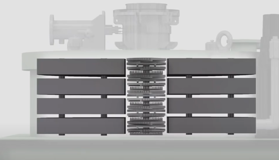 그리고 자석을 이용한 탈철 공정입니다. 주로 전류를 흘려 자력이 생기는 전자석을 주로 활용하고 있습니다. 자석의 효과성을 높이기 위해서 가능한 자석에 제품이 닿는 면을 넓히는 것이 중요합니다. 그래야 생산 효율성도 높이면서 제품에 숨어있는 자성이물을 제거할 수 있기 때문입니다. 그래서 자석의 모양과 구조, 단 수, 각도 등이 중요한 요소로 작용하게 되어 전자석 업체들의 기술 개발이 이어지고 있습니다. 아래 사진의 여러 층으로 구분된 가운데 부분으로 제품이 통과하게 됩니다. 양쪽에는 코일로 감싸져 있는데 전력을 사용하게 되면 자력이 활성화됩니다.