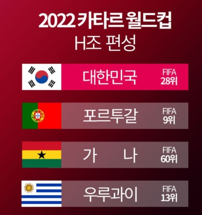 우리나라는 마지막조인 H조에 편성되었습니다. 대한민국은 FIFA 랭킹 28위이며, 포르투갈은 9위, 가나는 60위, 우루과이는 13위입니다.