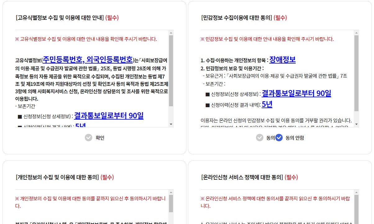 아무래도 부모급여 대상자 확인을 위해 개인정보를 활용하게 됩니다. 모두 필수 활용정보이기 때문에 동의 후 다음 단계로 넘어가주세요.