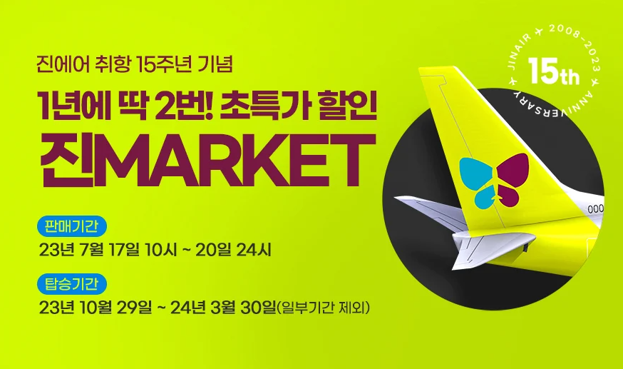 진에어가 17일부터 3일 동안만 2023년도 하반기 진마켓을 실시합니다. 항공원 최대 할인을 1년에 딱 두 번만 진행하는 행사로 자주 오는 행사가 아니기 때문에 할인율이 큽니다. 추가 혜택 정보도 작성하였으니 확인하시고 저렴한 쇼핑 하세요!