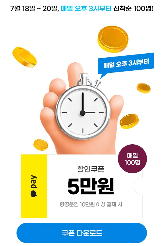 매일 오후 3시에 10만 원 이상의 항공운임을 카카오페이 결제 시 사용 가능한 5만 원 할인 쿠폰이 주어지는 행사도 진행하고 있으니 할인 쿠폰을 받아보세요!(7/18~20 한정)