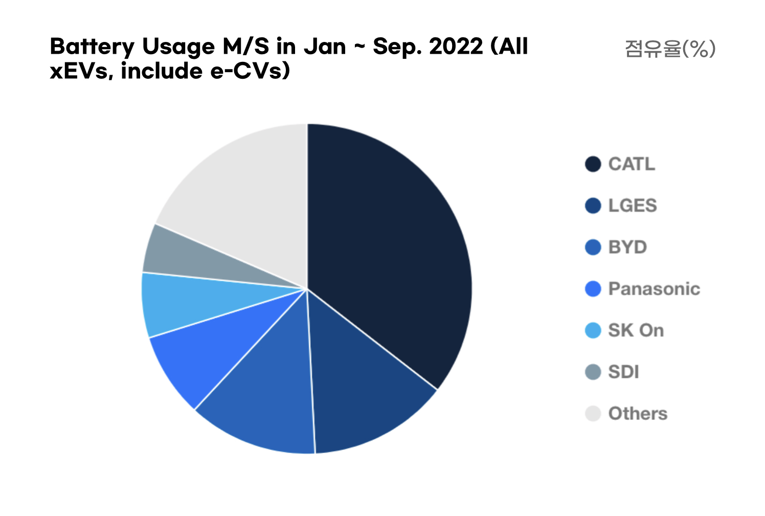 중국을 제외한 배터리 시장점유율을 보면 LG에너지솔루션이 1위의 자리이지만 CATL의 비중국국가에 영향력이 커질경우 국내 3사에는 위험성이 크게 작용할 수 있을 것 같습니다.
